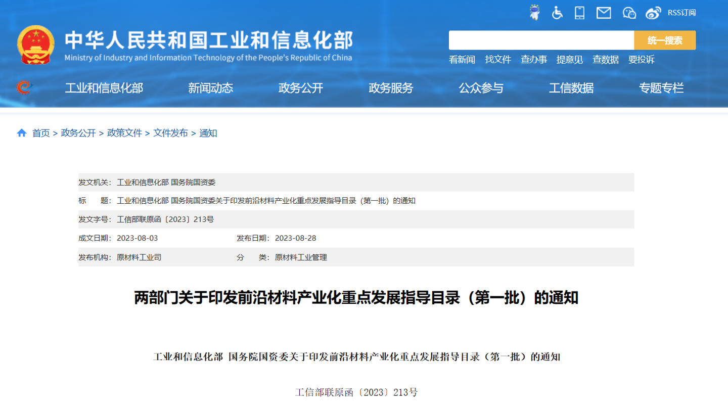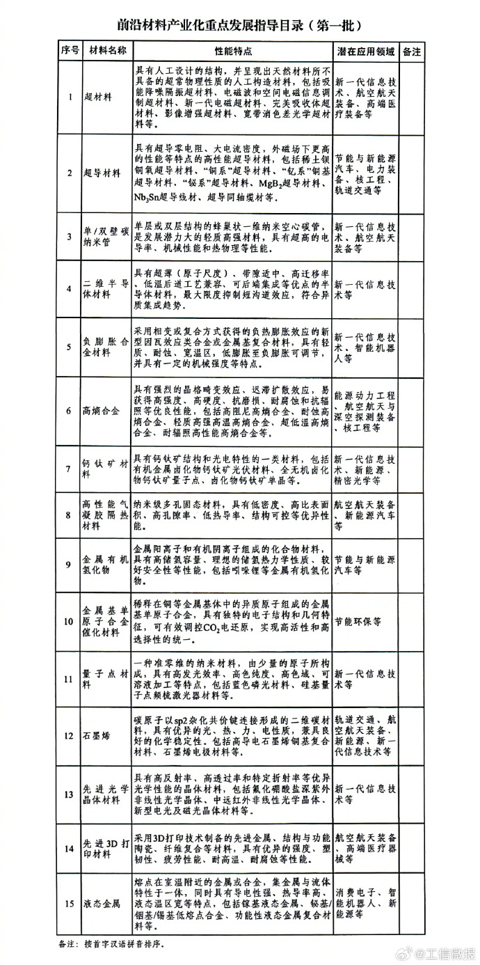 超导材料、液态金属等在列,工信部、 国资委联合发布第一批前沿材料产业化重点发展指导目录发表时间:2023-08-28 16:12 IT之家 8 月 28 日消息,工信部、 国资委联合今日发布了第一批前沿材料产业化重点发展指导目录,加快前沿材料产业化创新发展,引导形成发展合力。 通知称,新材料产业是战略性、基础性产业,是未来高新技术产业发展的基石和先导。前沿材料代表新材料产业发展的方向与趋势,具有先导性、引领性和颠覆性,是构建新的增长引擎的重要切入点。为加快前沿材料产业化创新发展,引导形成发展合力,工业和信息化部、国务院国资委聚焦已有相应研究成果,具备工程化产业化基础,有望率先批量产业化的前沿材料,组织编制《前沿材料产业化重点发展指导目录(第一批)》,后续将根据技术发展情况,适时分批发布。 ![]() IT之家附第一批前沿材料产业化重点发展指导目录名单内容: 超材料、超导材料、单 / 双壁碳纳米管、二维半导体材料、负膨胀合金材料、高熵合金、钙钛矿材料、高性能气凝胶隔热材料、金属有机氢化物、金属基单原子合金催化材料、量子点材料、石墨烯、先进光学晶体材料、先进 3D 打印材料、液态金属 ![]() |